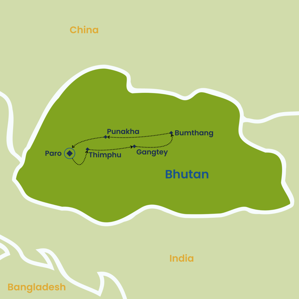 This 12-day Bhutan journey immerses you in both iconic landmarks and rare cultural experiences. Begin in Paro and Thimphu, where highlights include the vibrant Thimphu Tshechu festival, with its colorful mask dances and spiritual rituals. Continue to Gangtey’s serene glacial valley, home to black-necked cranes and timeless village life, before crossing high passes to reach Bumthang, the spiritual heart of Bhutan, with its sacred temples and monasteries. Explore Punakha’s riverside dzong and countryside, then return to Paro for the legendary Tiger’s Nest hike, blessings at ancient monasteries, and panoramic views from Chelela Pass—an unforgettable journey into Bhutan’s living traditions and landscapes.
